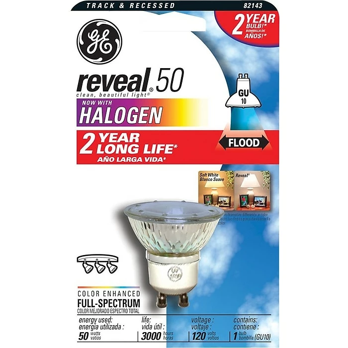 GE Reveal® Quartzline® 50 W MR-16 Halogen floodlight in clear color renders clean beautiful light by filtering out dull, yellow rays for a bright surrounding. Floodlight has a GU10 base for durability and can be used as indoor spot light.