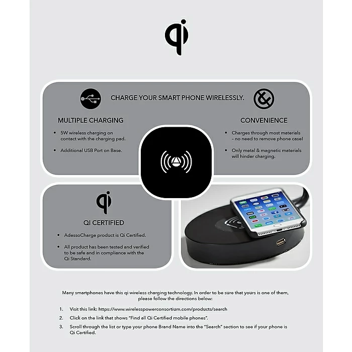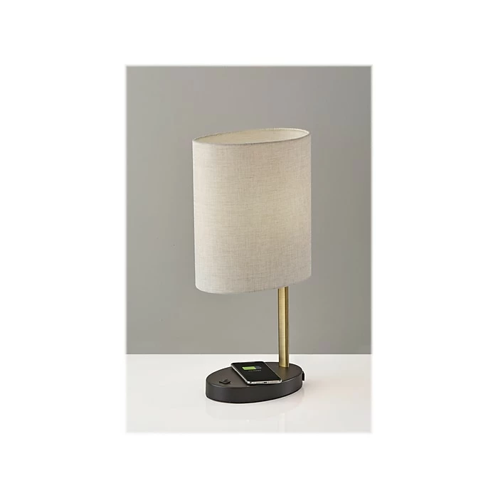 The Adesso Curtis table lamp is a modern-style table lamp that includes a wireless charging pad with the Qi inductive charging technology. Many smartphones have Qi technology built in, so just place your phone on the pad, and it will charge right up. No cords, no mess. It’s that easy. The product has been tested and verified to be safe and in compliance with the Qi standard. The AdessoCharge pad supports 5W charging on contact with the charging pad, which gets your phone from 0% to 100% in just 3-4 hours, depending on your phone model. A USB port is located on the base and can charge up a second device simultaneously. AdessoCharge is unique in that you can use the AdessoCharge pad, the USB, and the light all at the same time with maximum efficiency of all three. A beautiful texture on the taupe fabric shade reveals itself when lit. A sleek AdessoCharge pad design that is flush with the surrounding area provides an attractive charging station with easy access to your phone while it’s charging. Just plug in the lamp, and the charger will work. The light on the lamp does not even need to be turned on. This wireless charging pad will charge your phone through most materials, so you do not even need to remove your case. Only metal will hinder the function of the charging pad to charge through the case.