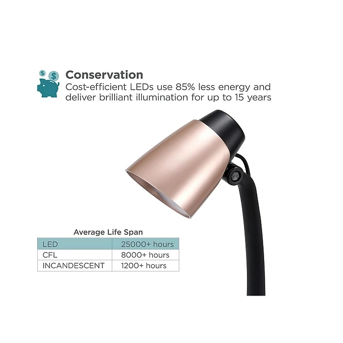 If you’re in search for a simple lamp with style, look no further than this LED Black & Decker rose gold desk lamp. With a black lamp arm and base, it takes on a classic look, perfect for an office, in a dorm, or on a bedside table. The metallic rose gold lampshade brings a light pop of color, providing a modern style. This rose gold lamp mimics the look of natural daylight, perfect for those long, focused days at work. Additionally, it uses only 3.5W of power and LEDs that last up to 50000 hours. Reliable and easy to use, this desk lamp is too good to pass up.