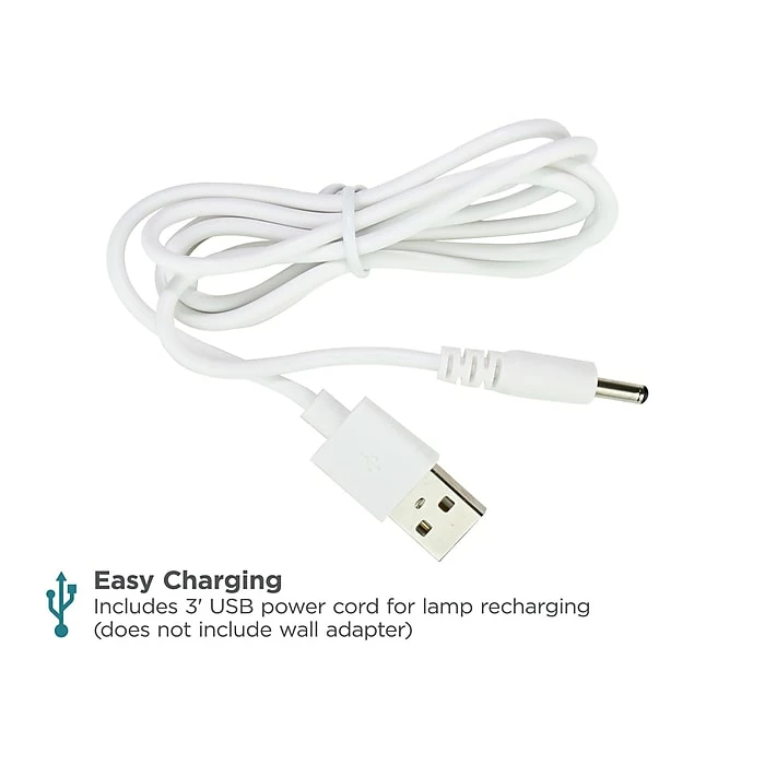 - Includes 3′ USB power cord for lamp recharging (does not include wall adapter)