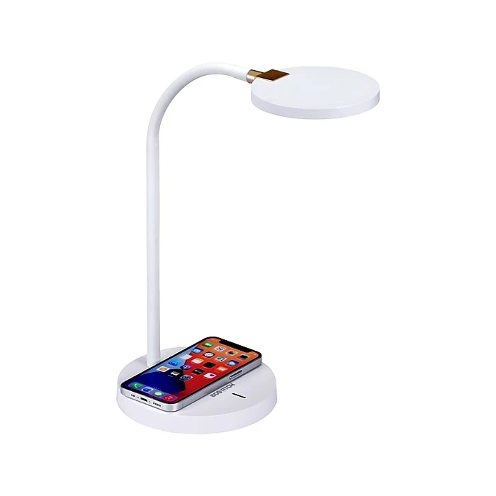 Sleek design meets functionality with the Qi wireless charging LED desk lamp from Bostitch. Charge your phone without any messy wires with a wireless charging pad built into the lamp’s base, and keep your phone within reach to never miss a phone call. With minimalistic design, this white desk lamp can dim to the perfect lighting level for you. Simply use the touch sensor to adjust between the three brightness levels for assorted tasks. Use the flexible silicone neck to easily position the light zone where needed whether you are reading, studying, or knocking out some work at the office. This lamp is also equipped with true white LEDs that make for an optimally productive environment. This lamp is the perfect addition to any home office, craft room, or workspace.