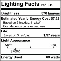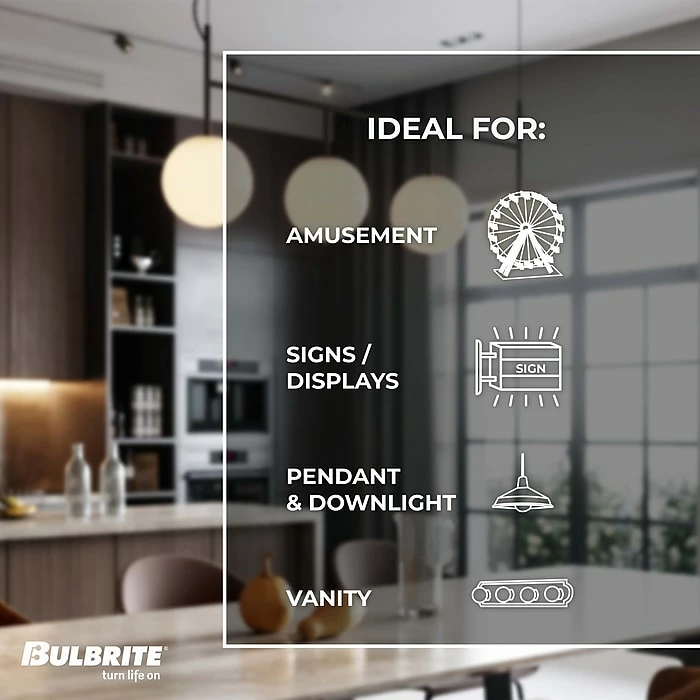 Bulbrite’s line of Incandescent globes are the perfect option for any household fixture, such as bathroom vanity’s or open chandeliers. Ideal for use in vanities and home decor lighting. Fully dimmable Incandescent globe.