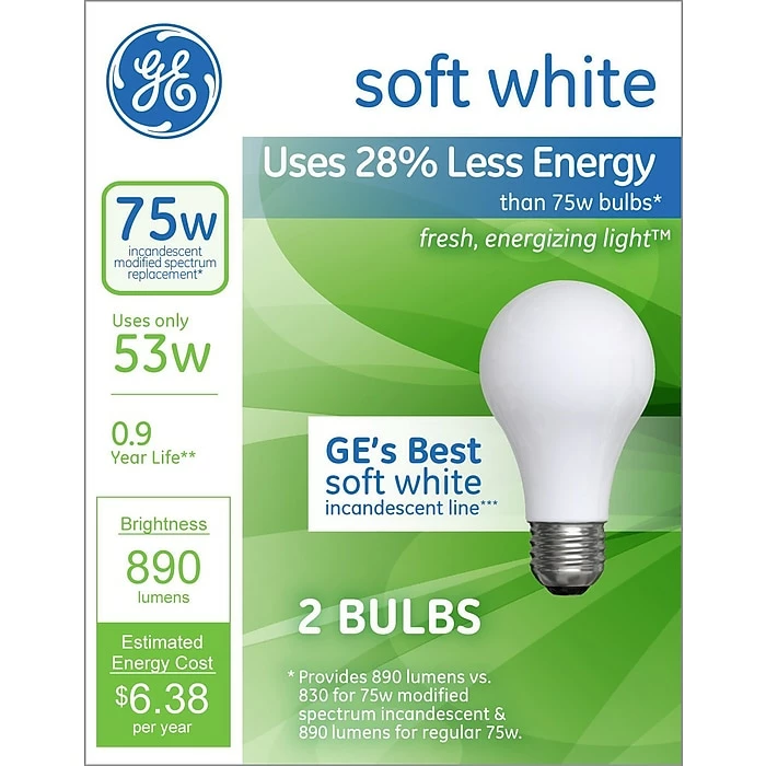 - Light bulb wattage: 53 watts; incandescent equivalent: 75 watts