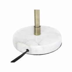 - Made of metal with a white marble base, features an antique brass finish with matte black shade