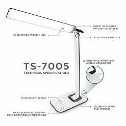 Our RelaxaLight is an elegant LED desk lamp with a number of great features that make it an essential part of your office, desk and room. Touch sensor controls changes light intensity and light color to match your mood and task. Full motion design allows you to place the lights right where you need them. In addition to the increased level of brightness and flicker-free soft illumination, LED lamps will also save you tons of money for a greater luminosity than you would get from a 60 Watt incandescent bulb. The sophisticated engineering of the vivid LED diodes provide soft and bright lighting. They have also been designed with health conscience eye protective lighting. TS-7005 LED Desk Lamp is as bright as a 75W of incandescent light while consuming 75% less power. With a 15 year life span, this lamp will pay for itself in the long run.