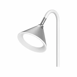 - Made of aluminum in matte white with chrome accents; features a cone shade