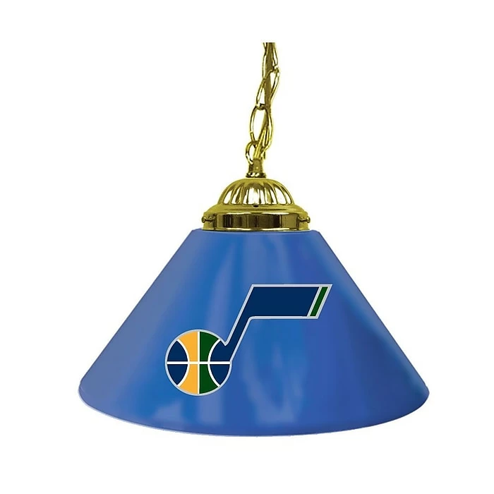 Trademark NBA Utah Jazz 14″ Single shade gameroom lamp in blue color features polyresin shade construction with gold finish and hanging chain measures 36″. Lamp has a maximum bulb wattage of 60 W and pull chain on/off switch.
