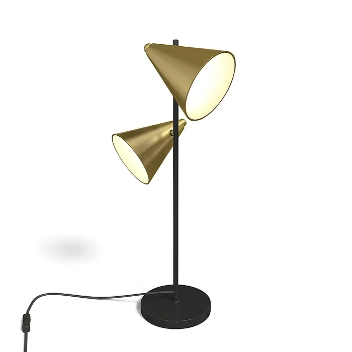 - High-quality black metal base with an adjustable brass-finish metal cone shade