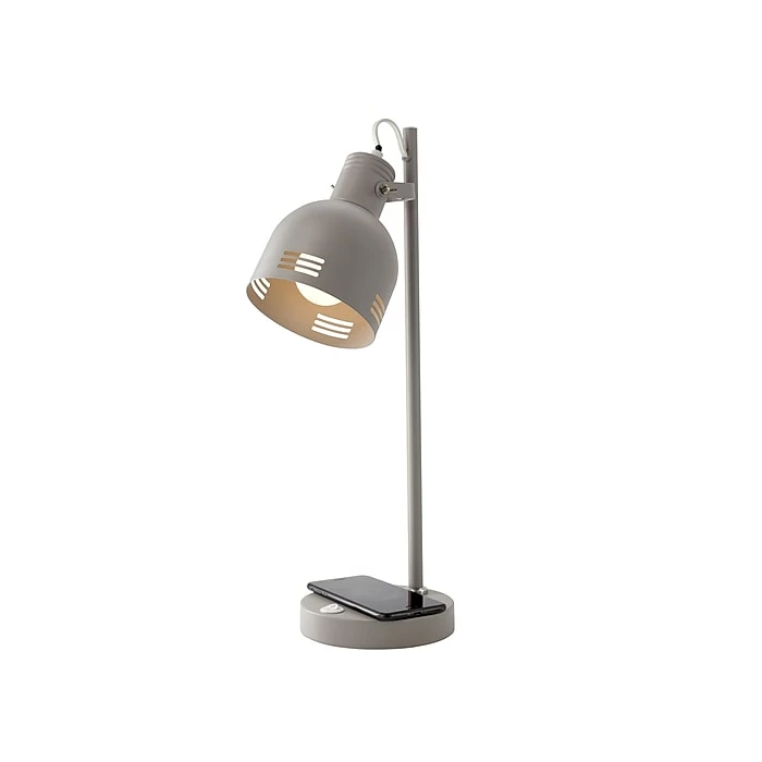 The stylish V-Light LED desk lamp is made of metal and comes in a matte gray finish. With an adjustable shade, this desk lamp is perfect to illuminate all areas of your workspace. A 9W replaceable LED bulb has an average rated life of 30000 hours. In addition, the E26 (medium) base features a smartphone Qi-compatible wireless charging option, which is really useful at busy times.