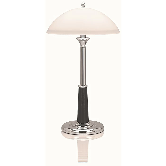 - Comes in a bright chrome finish with a black leatherette accent trim, and a frosted off-white glass shade with finial topper