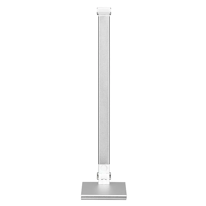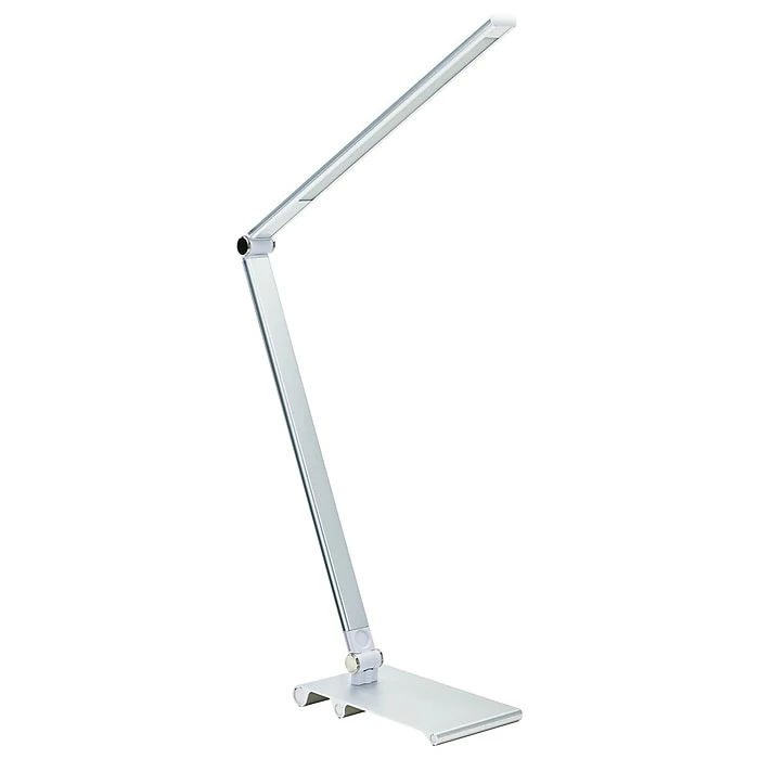 This energy-efficient 5W LED desk-task lamp is perfect for any home or office, with a contemporary design that will complement any decor. The bright 5W non-replaceable LEDs have an average rated life of 20,000 hours for long-lasting performance. Includes a built in diffusor to evenly distribute light and help to eliminate glare. Features a 3-level dimming touch switch to easily adjust light brightness. The 2-point adjustable arm helps direct the light where needed. Constructed of long-lasting aluminum with a metallic silver finish, the lamp stands about 15 inches tall in the usual user position. Its”compact footprint measures 6″ x 3.5″, making this an ideal lamp for small spaces. This lamp is ETL listed. Includes a manufacturer’s 90 day limited warranty.